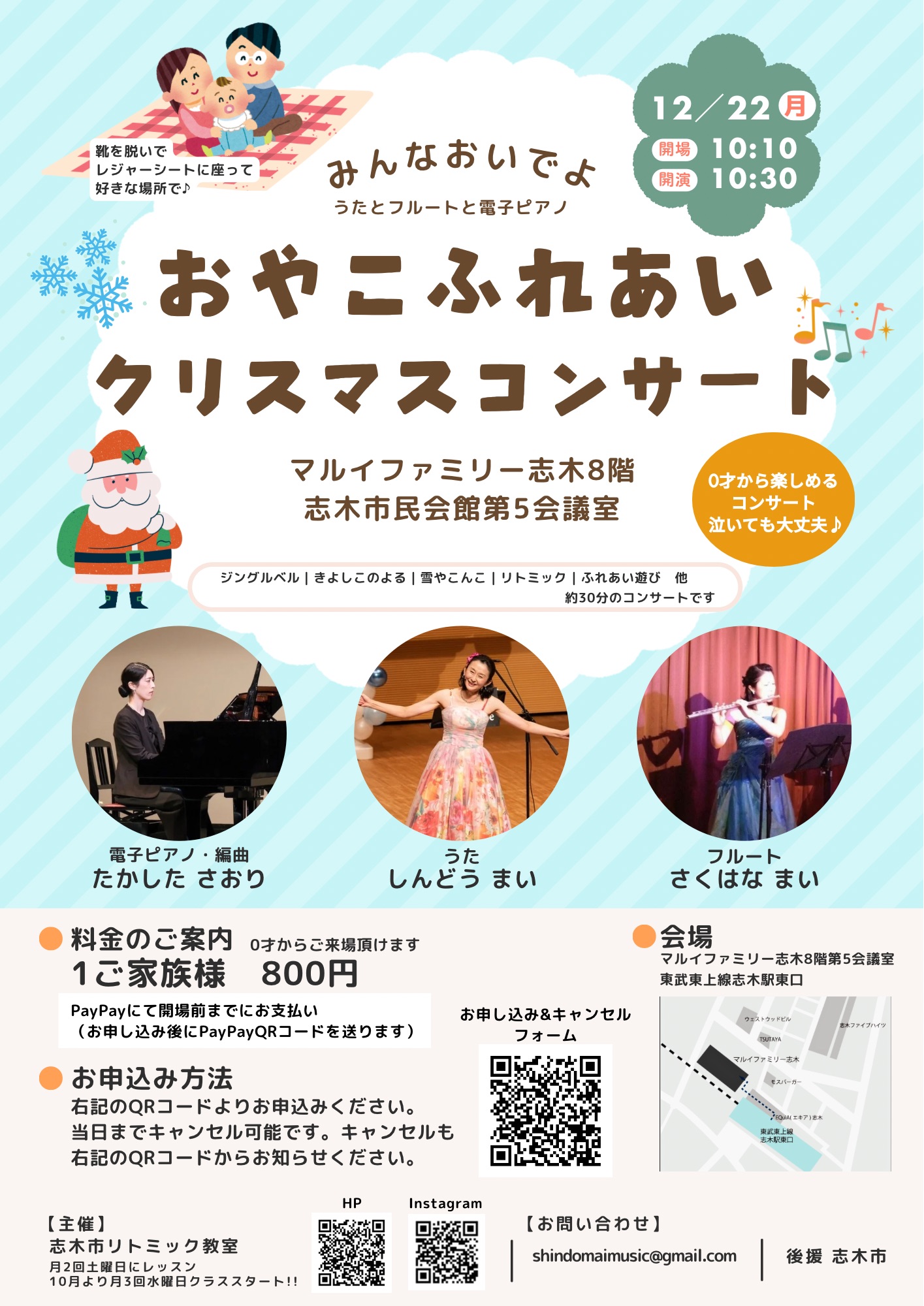 日時:12月22日(月)10:10開場 10:30開演 約30分のコンサート 1ご家族800円 Paypayでのお支払いのみ